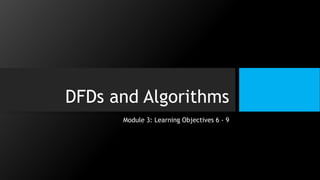 This document discusses data flow diagrams (DFDs) and algorithms for problem solving. It defines a DFD as a graphical depiction of how data moves through an information system using common symbols like processes, external entities, data flows, and data stores. The purpose of a DFD is to create a model of a system that is easy to understand. It then outlines the typical procedure for producing a DFD, including identifying system boundaries, functions, and data links. The document also discusses important considerations for DFDs like precisely labeling processes and focusing on logical data flows rather than physical implementation details. Finally, it provides a brief introduction to problem solving algorithms as step-by-step methods for achieving a desired result.
