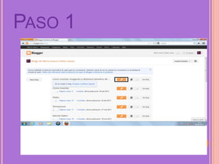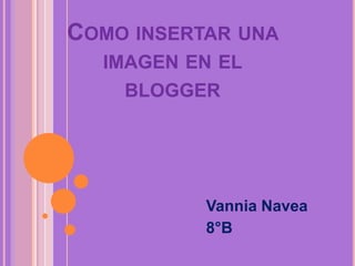 This document provides instructions for inserting an image into a Blogger blog post in 4 steps: select the image you want to add, click the "Insert Image" button, select the image file from your computer, and resize or position the image as desired.