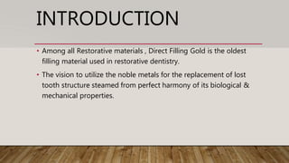 Direct filling gold is the oldest restorative material used in dentistry due to its biological and mechanical properties. It exists in various forms including gold foil, electrolytic precipitate, and powdered gold. Gold foil can be cohesive or non-cohesive depending on surface contaminants. Manipulation of direct gold restorations involves degassing to remove surface gases followed by compaction. It is primarily indicated for small, non-stress bearing cavities where esthetics are not a concern due to its biocompatibility and ability to be cold welded. Disadvantages include its color, potential for increased sensitivity, and difficulty of manipulation.