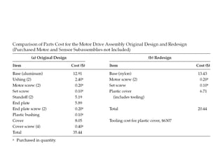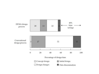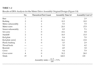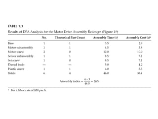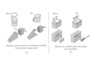 The document discusses design for manufacturing and assembly (DFMA). It covers the fundamentals of DFMA, including design for manufacture, design for assembly, and differences between the two. It also provides examples of applying DFMA principles and guidelines to redesign a motor drive assembly to reduce the number of parts from 19 to 4. Reasons for not implementing DFMA are listed, such as lack of time, low volume production, and refusal to use DFMA tools. Advantages of applying DFMA during design include reduced cost, time to market, and improved quality.