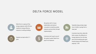 The document discusses a Delta Force project to implement energy efficiency measures at the Claude Moore Health Sciences Library to reduce electricity consumption and bills. The project would replace lighting, HVAC equipment and controls, and plumbing fixtures to achieve an estimated 34% reduction in energy usage. It would be paid for through the savings on the library's utility bills, with no upfront cost to the library. Implementation is projected to begin in fall 2019 and be completed by spring 2021.