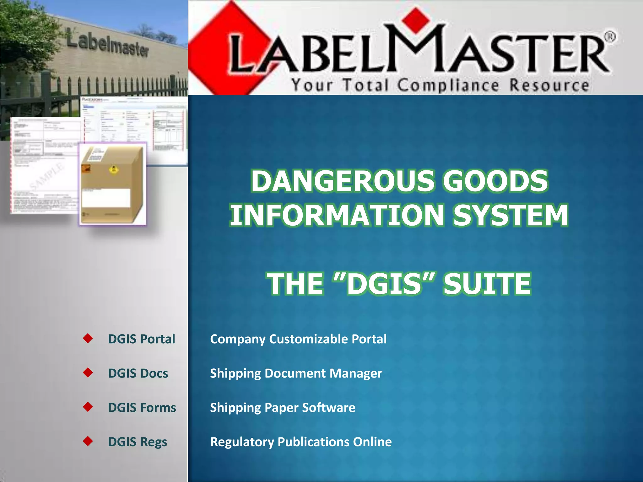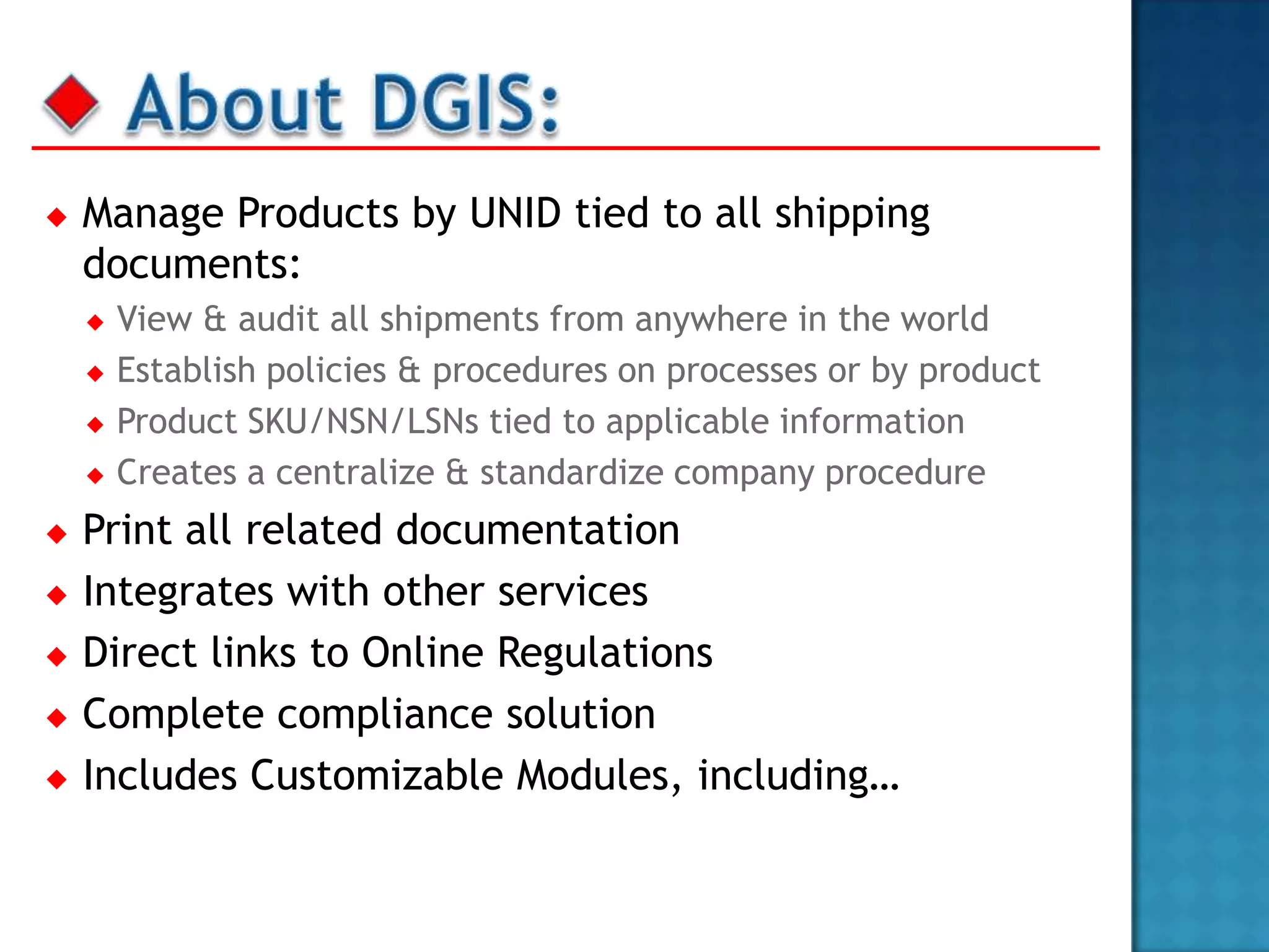 The document describes a modular shipping compliance software system called DGIS that includes features like a customizable company portal, document management, shipping form software, online regulatory publications, and tools to manage products and view all related shipping documents. It allows users to create validated shipping papers, print documents, view regulations, and manage users. The system aims to help companies standardize procedures and ensure complete compliance with dangerous goods regulations.