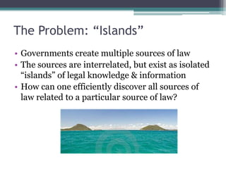 The document discusses adapting the Parallel Table of Authorities (PTOA) from the U.S. Code of Federal Regulations for use in a digital environment. The PTOA currently exists as specialized legal metadata that links statutes to related regulations but has several obstacles to being processed by software, including ambiguous relationships, lack of granularity, directionality issues, and inconsistent data quality. The document proposes addressing these issues by expressing the PTOA in XML or RDF/OWL to make the relationships explicit and machine-readable in order to enable new uses and applications of the PTOA in the digital domain.