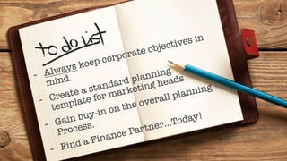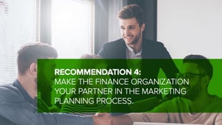 The document outlines key strategies for effective marketing planning, emphasizing the importance of aligning marketing plans with corporate objectives and integrating both top-down and bottom-up planning approaches. It introduces four best practices for marketing performance management (MPM) and discusses the necessary communication between marketing and finance to ensure success. Additionally, the document highlights the role of marketing organizations in lead generation and provides resources for attendees of the sponsored webinar.