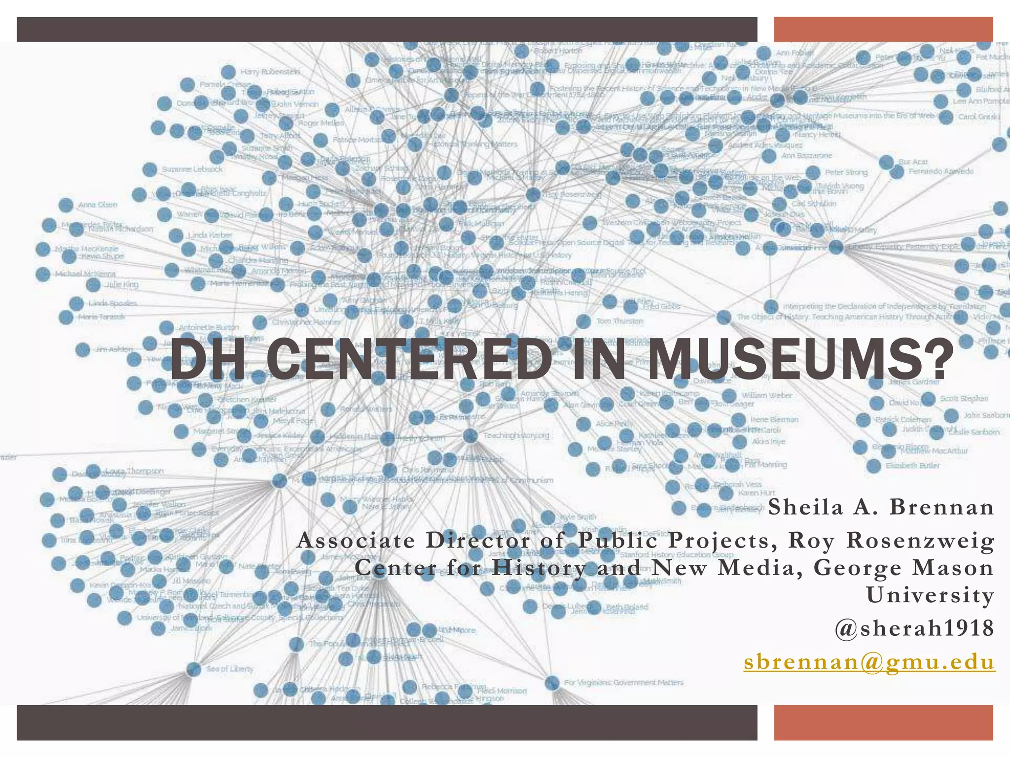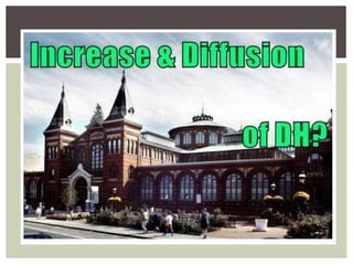 This document discusses the potential for digital humanities (DH) centers within museums. It provides examples of existing DH projects at museums that digitize collections, visualize and connect data, experiment with tools like GitHub, produce digital publications and scholarly editions, and more. The document advocates that museums spearhead digital projects, focus on digitizing objects/images/sounds, build staff capacity, collaborate internally and externally, and facilitate online connections. DH centers in museums could lead public humanities work and help bring history museums into the digital realm.