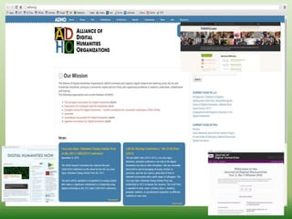 This document provides an overview of digital humanities (DH), including brief definitions and history, examples of DH projects and tools, and the role of libraries in supporting DH. Some key points include: