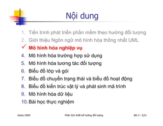 Tài liệu này thảo luận về các phương pháp phát triển phần mềm, mô hình hóa doanh nghiệp và mối quan hệ giữa các tác nhân trong một tổ chức. Nó đề cập đến cách thức tổ chức hoặc cá nhân có thể tương tác với nhau thông qua các vai trò trong các quy trình nghiệp vụ, cũng như cách xác định trách nhiệm và nhiệm vụ của từng cá nhân. Ngoài ra, tài liệu cũng giới thiệu về cách phân tích các trường hợp sử dụng trong mô hình kinh doanh.