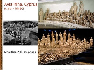 The document discusses a multidisciplinary study of over 2000 terracotta statue fragments from the site of Toumba in Salamis, Cyprus dating to the 8th-7th centuries BC. Non-invasive analytical techniques such as 3D scanning, microscopy, and chemical analysis are being used to characterize the manufacturing techniques and help reassemble the fragments. Initial results identified different clay sources, surface treatments, and pigments used in the polychrome statues. The project aims to digitally reunify the fragments scattered across museums to aid research and cultural heritage management.
