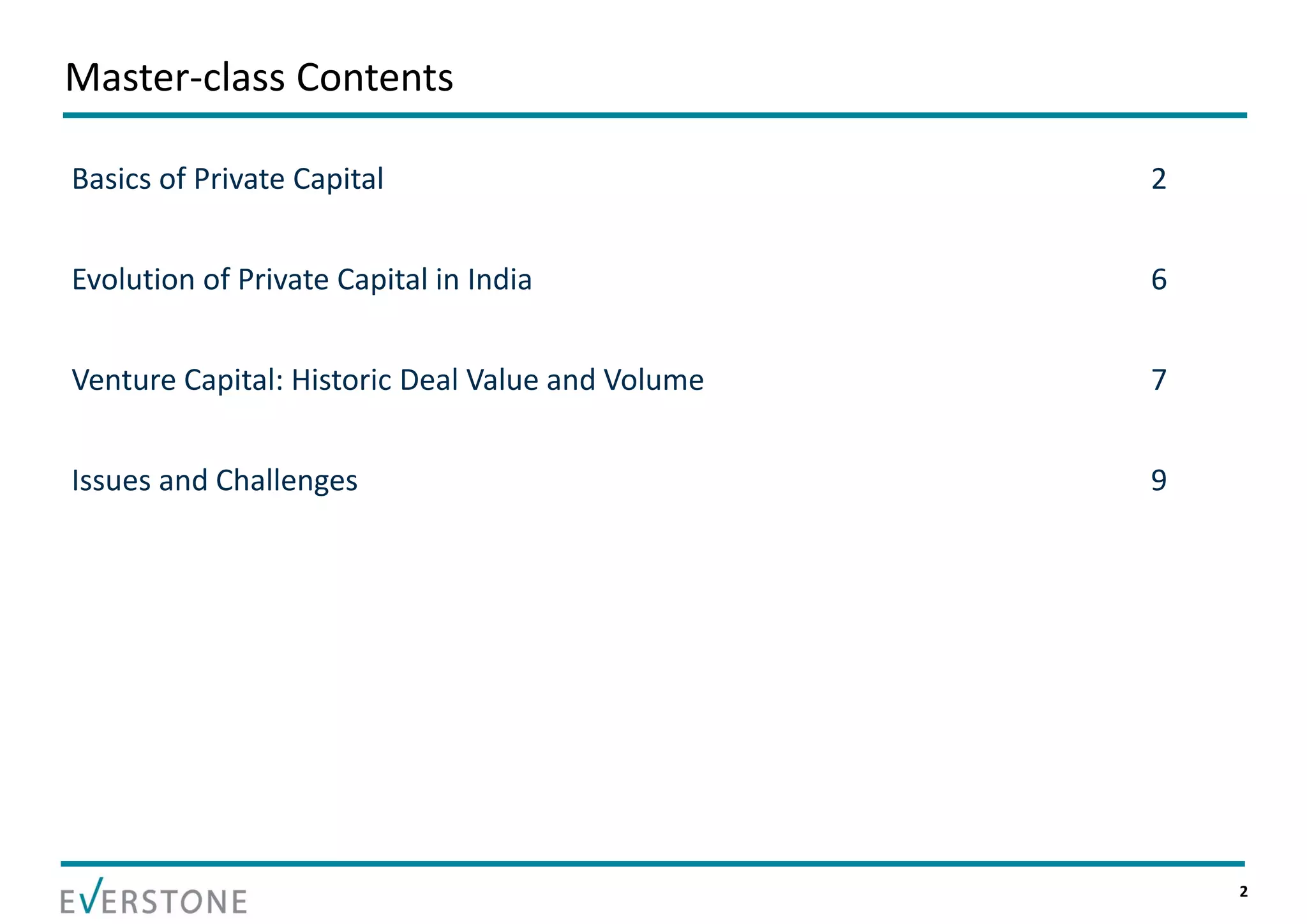 The document summarizes key topics relating to private capital and venture capital in India. It discusses the evolution of private capital in India from the 1980s onward. It provides data on historical venture capital deal value and volume in India, with 2011 being a record year. The top 5 venture capital deals of 2011 are listed. The rest of the document outlines various aspects of the venture capital process, including the pre-investment and post-investment phases, managing exits, tips for a successful partnership between entrepreneurs and investors, and challenges that can arise.
