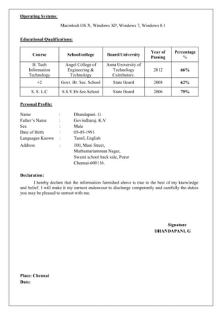 Dhandapani is a graphic designer and Indesign paginator seeking a challenging position where he can apply his technical and analytical skills. He has over 3 years of experience in graphic design, typesetting, and freelance UI design for desktop, mobile, and tablets. He is proficient in Adobe software like Indesign, Illustrator, and Photoshop. His responsibilities include concept planning, production, proofreading, and managing large documents. He has a B.Tech in Information Technology.