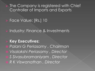 The document provides key information about a company registered in India with the Chief Controller of Imports and Exports. The company operates in the finance and investments industry, has a face value of Rs. 10, and its key executives include Palani G Periasamy as Chairman and Visalakshi Periasamy and S Sivasubramaniyam as Directors. The company head office is located in Chennai, Tamil Nadu, India.