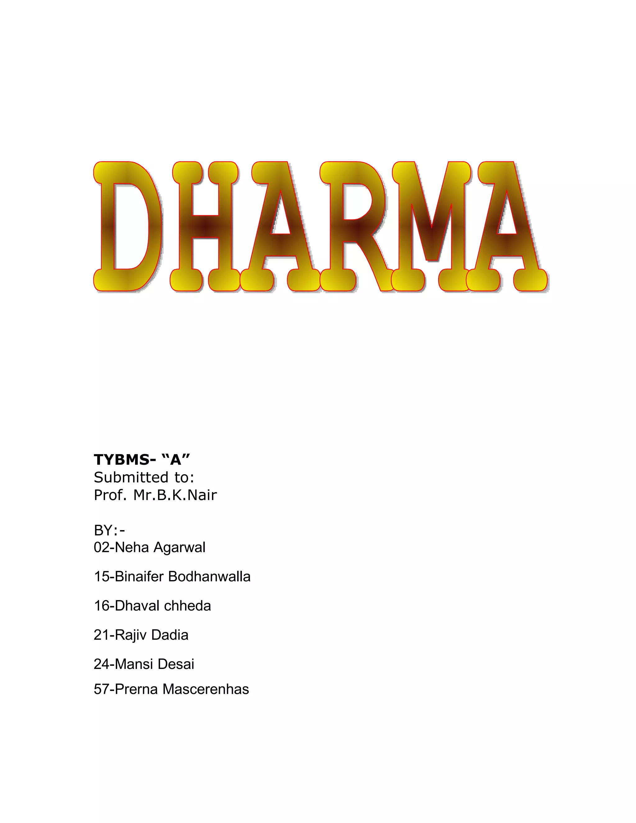 This document discusses the concept of Dharma in Hinduism and its relationship to Karma. It provides definitions and explanations of Dharma as upholding one's duties and being righteous. It discusses Dharma as encompassing universal duties as well as personal duties. The document also explores how the concepts of Dharma and Karma can be applied in corporate settings to help guide employee behavior and performance. Specific strategies are suggested, such as reducing ego through equal treatment of all employees regardless of role.