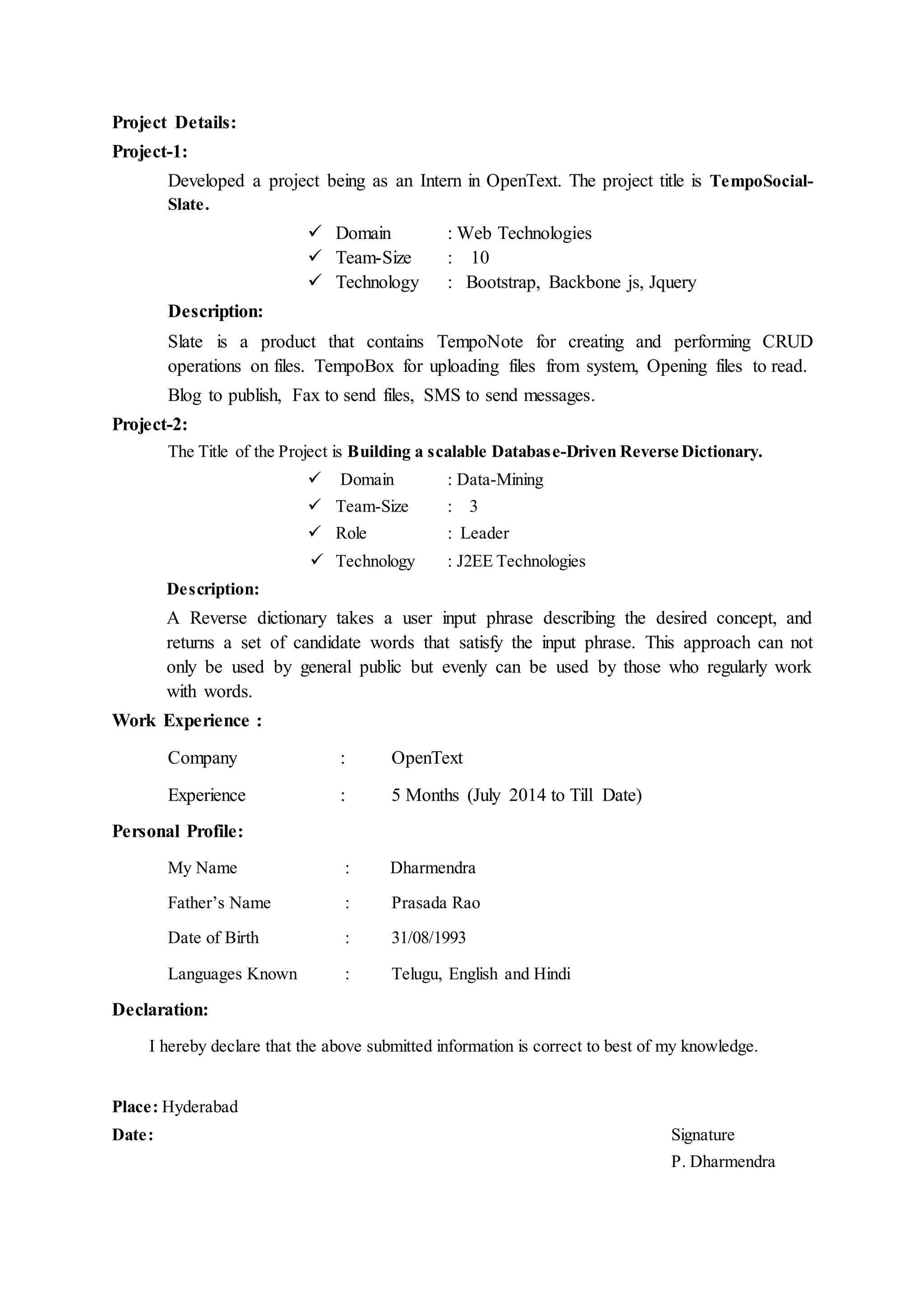 Dharmendra Pasumarthi is seeking a career opportunity that provides growth and satisfaction. He has a B-Tech in computer science from Sri Vasavi Engineering College with 73.86% marks. His technical skills include programming languages like C and Java, databases like Oracle, and web technologies like HTML5, CSS, JavaScript, PHP, Bootstrap, and AngularJS. He has work experience as an intern at OpenText where he developed projects using technologies like Bootstrap, BackboneJS, and jQuery. He is looking to apply his leadership, problem solving, and quick learning abilities.