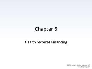 This document discusses various methods of health care financing in the United States including private insurance, public programs, and the Affordable Care Act. It covers key topics like the role of insurance, common health insurance terminology, types of private plans including employer-sponsored and individual plans, public programs like Medicare and Medicaid, and provisions and impacts of the ACA. The learning objectives are to understand concepts of health insurance, distinguish various plan types, examine public programs and insurance trends, and assess directions in health care financing.
