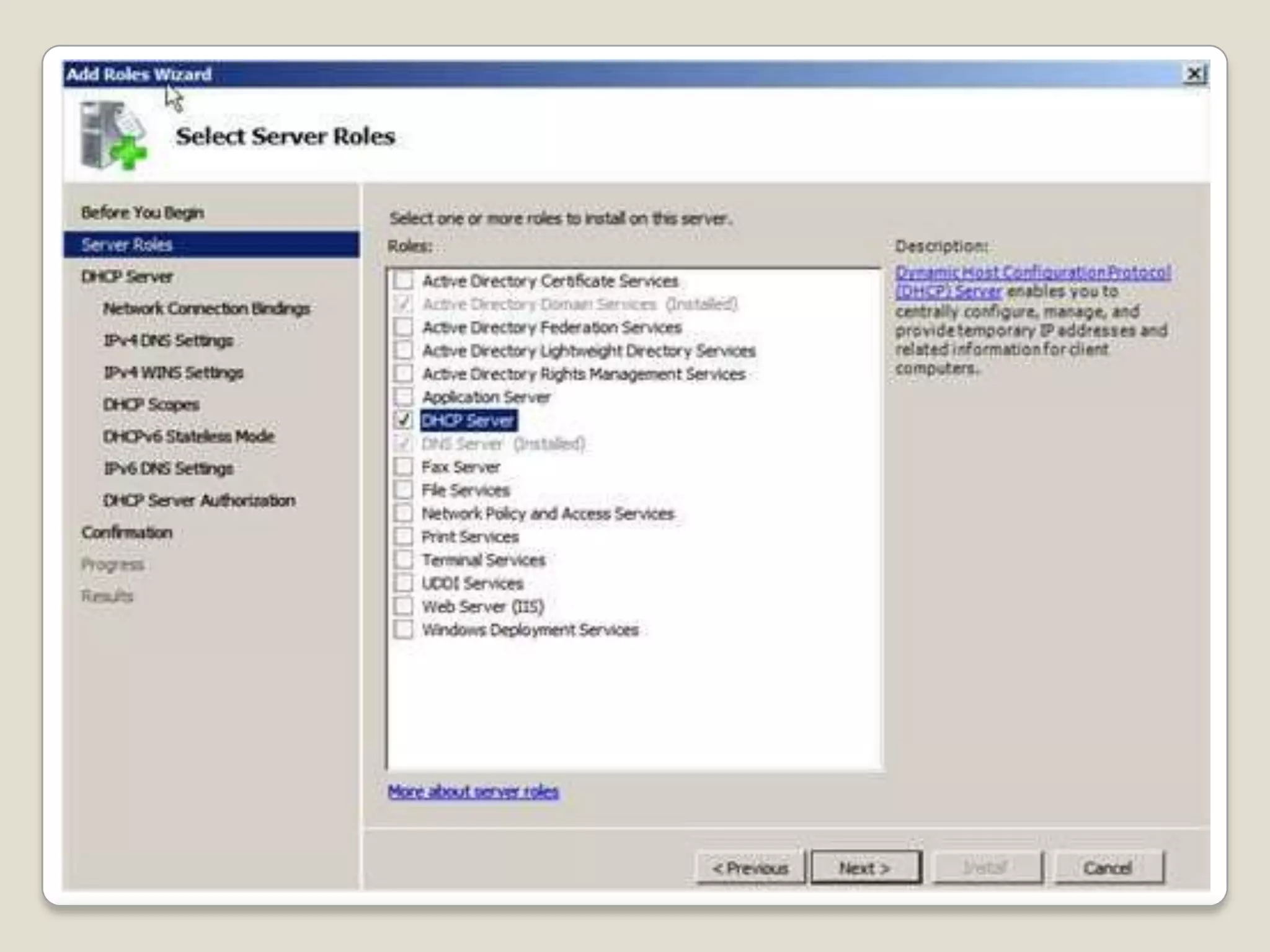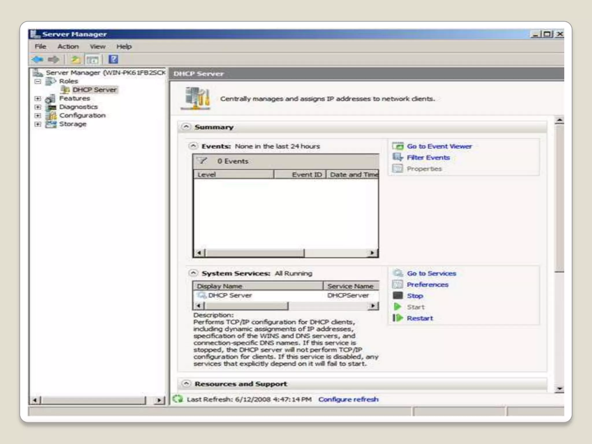 This document discusses DHCP, DNS, and proxy servers. It provides instructions on how to install and configure DHCP and DNS servers in Windows Server 2008. It explains what DHCP, DNS, and proxy servers are and their purposes. DHCP assigns IP addresses to clients, DNS maps domain names to IP addresses, and proxy servers allow indirect network connections between clients and other servers.