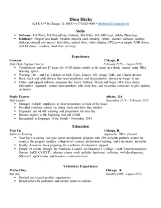 Dion Hicks has experience as a help desk engineer intern at Comcast where he troubleshot IT issues for customers and supported various hardware and software. He is currently enrolled in a one-year career development program called Year Up focused on quality assurance and software development support. Previously, he worked as a shift leader at Panda Express where he managed employees and provided good customer service.