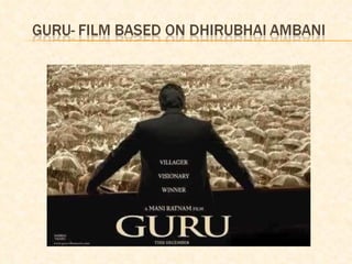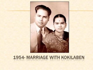 Dhirubhai Ambani was born in 1932 in Gujarat, India to a school teacher father. He had a demanding childhood and was known for his brilliance and hard work. He campaigned for socialists in his youth but later moved to Aden, Yemen at age 16 to support his family working for a trading firm. He learned the commodity trading business and started his own ventures. In 1962, he started a yarn and spices business that grew into the Reliance textiles company. Reliance textiles became one of the largest textile companies in India before diversifying into other industries. Dhirubhai Ambani passed away in 2002, leaving behind a business empire worth billions of dollars