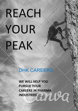 DHK Careers aims to help people pursue careers in the pharmaceutical industries. Their message encourages people to reach their peak and achieve their highest potential through the careers they provide guidance on. In just a few short sentences, they convey their goal of assisting others in obtaining jobs within the pharma sector.