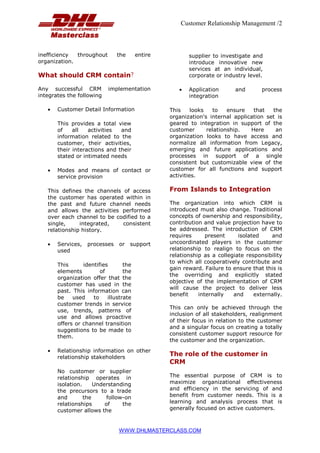 Customer relationship management (CRM) involves using customer data and integrating processes across channels to manage customer relationships, increase loyalty, and drive repetitive sales. Key aspects of CRM include collecting consistent customer data, reengineering processes to use that data, and integrating applications and channels to provide a unified view of customers. Establishing a successful CRM system requires changes to organizational processes, data management, and applications to fully integrate customer information and ensure all functions can effectively manage relationships.