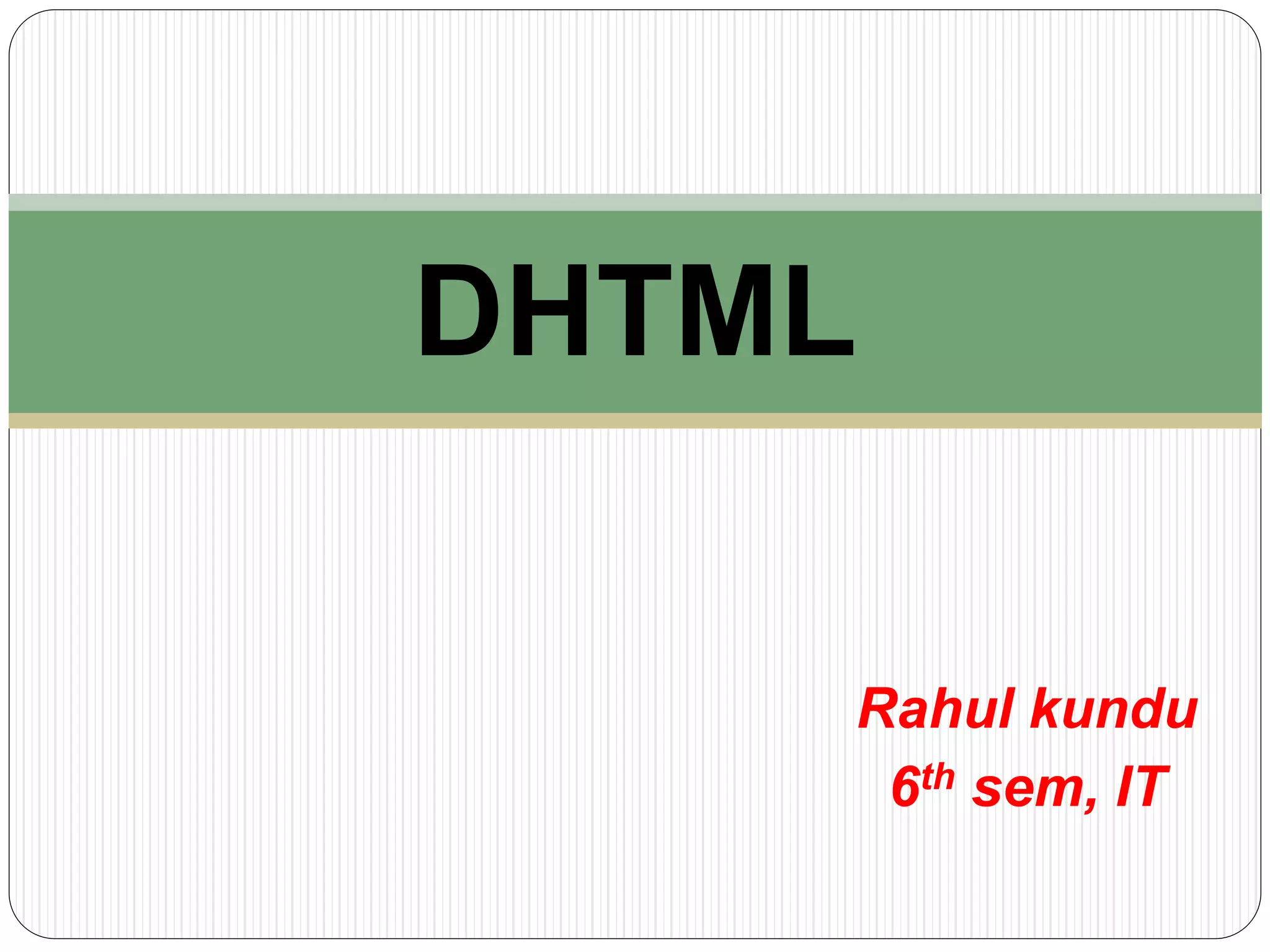 The document defines DHTML as a combination of technologies including HTML, JavaScript, CSS, and DOM that allows for dynamic and interactive webpages. It discusses how DHTML provides advantages like small file sizes, support in major browsers without plugins, and future standardization. However, it also notes disadvantages such as costly editing tools, only being supported by newer browsers, requiring long and complex coding, potential browser support problems, and unprotected source codes.