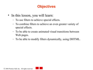 This document discusses dynamic HTML filters and transitions. It introduces various image and text filters that can be used to achieve special effects, such as flipping, transparency, shadows, gradients, and motion blur. It also covers visual transitions between web pages, allowing a pleasant transfer effect. The chapter then explains specific filters in more detail, including flip filters, transparency, image masks, and advanced filters. It provides an example HTML file to demonstrate applying flip filters to text.