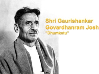 Morarji Desai was born in 1892 in Gujarat, India. He worked as a teacher earning a small salary before marrying and moving to Bilkha. He wrote over 492 short stories characterized by poetic style and powerful emotions. His works included novels, dramas, stories for children and elders. Desai was awarded several prestigious literary awards but refused the highest Gujarati literature award in 1935 to show dissent.