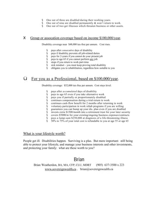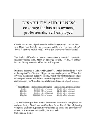The document discusses the inadequacy of disability and illness coverage for business owners and professionals in Canada, highlighting that many are only protected for a small percentage of their income. It emphasizes the need for advanced planning strategies to protect one's lifestyle, business, and family from income loss due to illness. Statistics show a significant risk of disability during working years, urging professionals to reconsider their coverage options for comprehensive financial security.