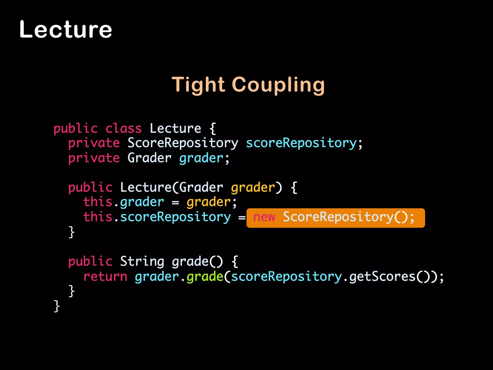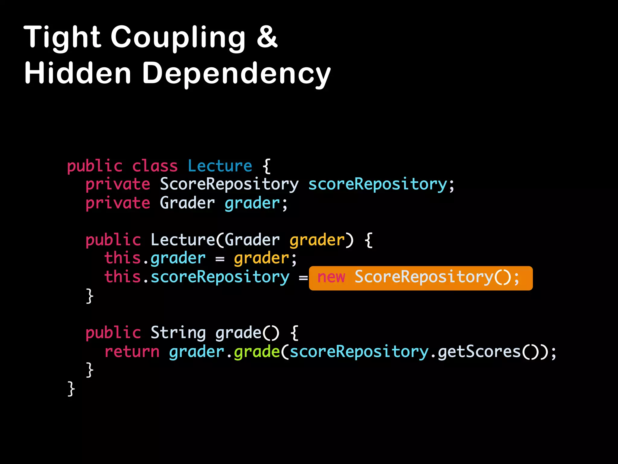 The document discusses dependency injection and loose coupling in Java applications. It describes how tightly coupling the Lecture class to the ScoreRepository class caused testability and dependency issues. To address this, the document suggests using dependency injection by modifying the Lecture constructor to accept the dependencies rather than creating them internally. This loosens the coupling and allows mocking dependencies for testing. It provides an example using Mockito to mock the ScoreRepository and test grading behavior without depending on the real implementation or external services.
