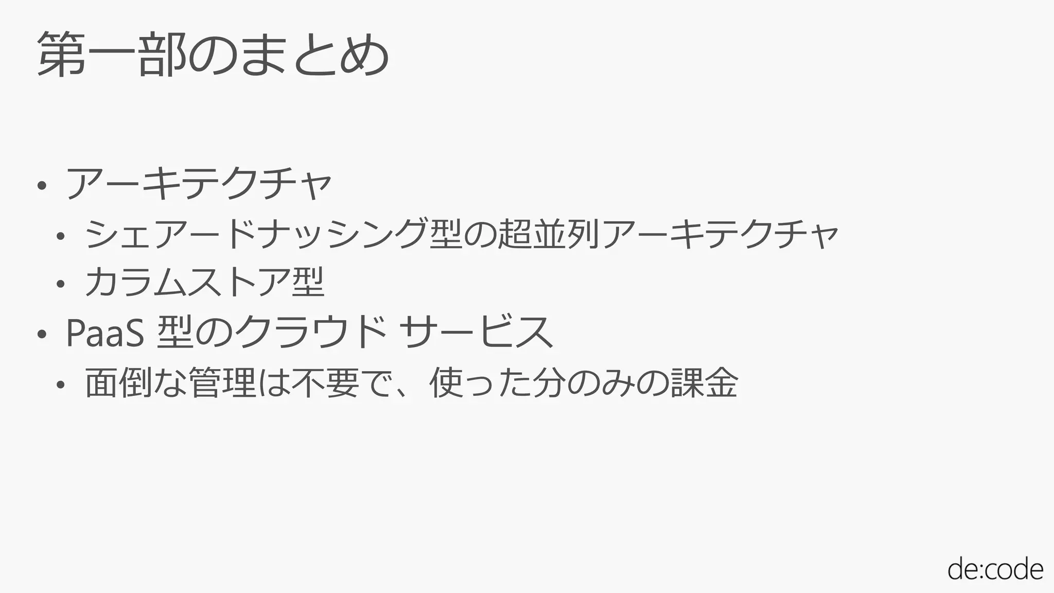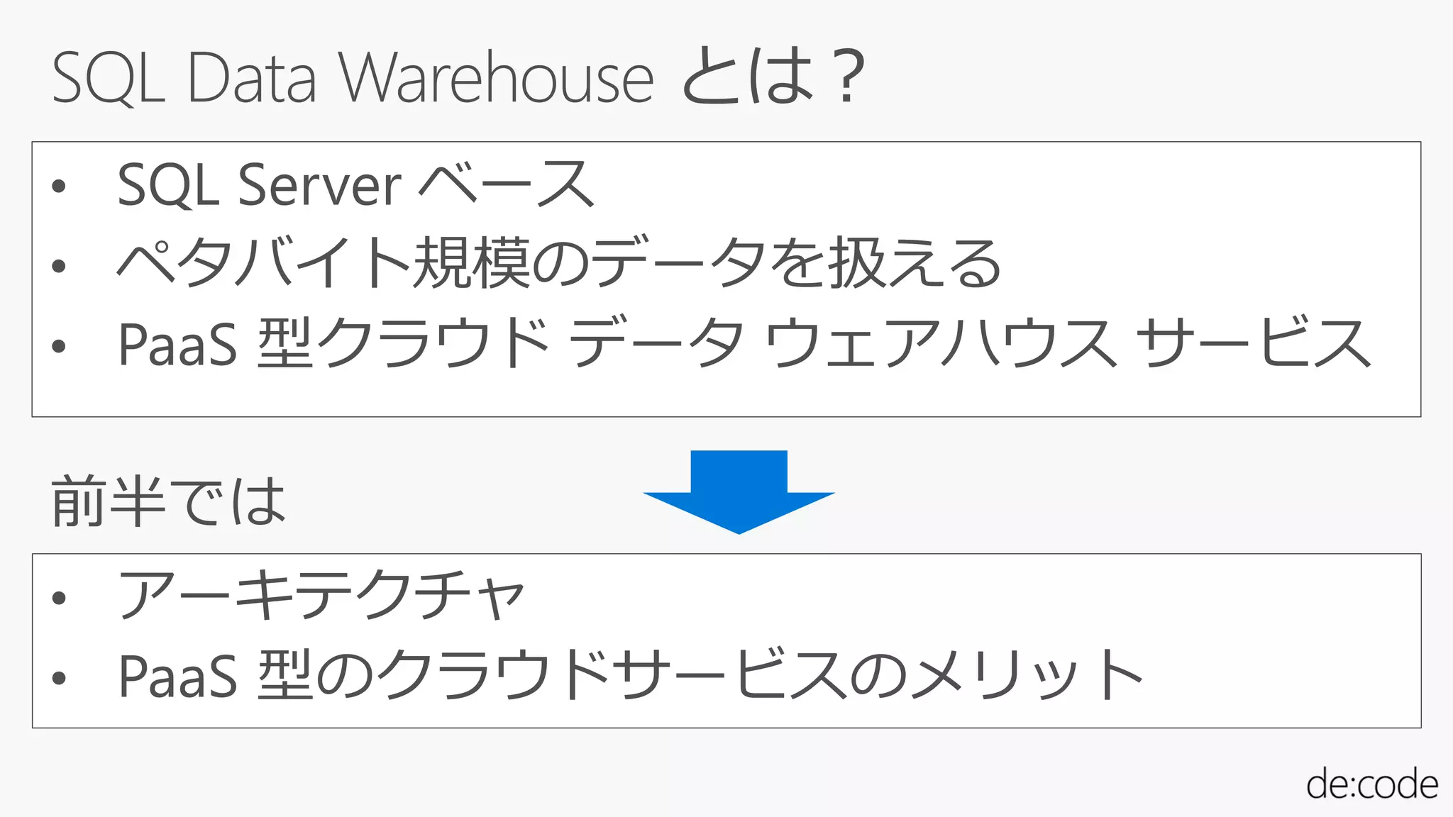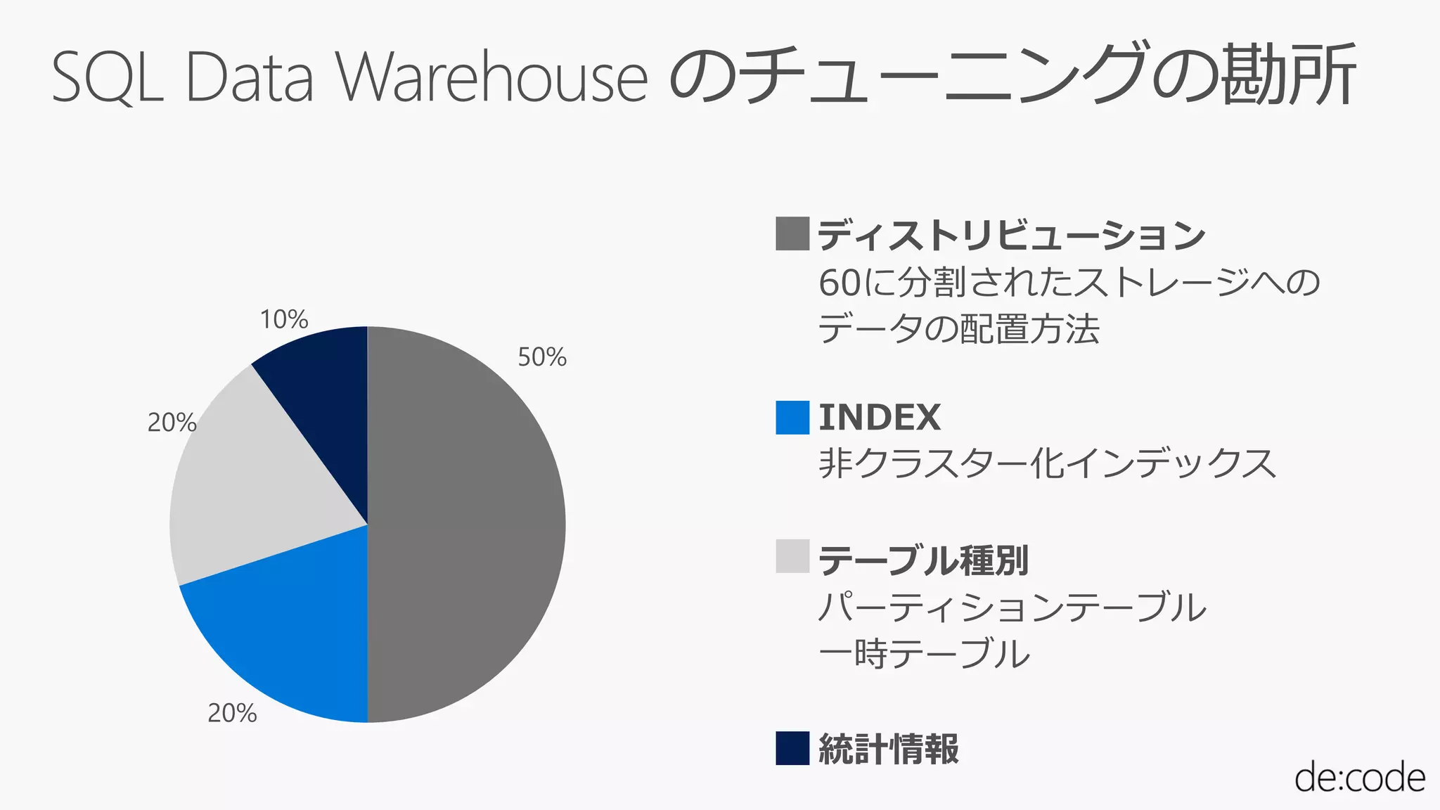受講対象: Azure SQL Data Warehouse でパフォーマンスに悩んでいる方、DWH 製品を検討中の方、別製品からの移行を検討中の方に最適なセッションです。