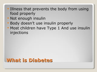 This document provides information about diabetes and how to care for students with diabetes in schools. It discusses what diabetes is, signs and symptoms of low and high blood sugar, new laws regarding diabetes care in schools, what glucagon is and how it is used to treat severe low blood sugar, proper storage and administration of glucagon, and what to do after administering glucagon. The overall purpose is to educate about diabetes and establish protocols for providing care to students with diabetes in schools.