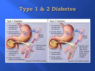 Diabetes is a condition where the body cannot properly process sugar due to a lack of insulin, which is produced by the pancreas. There are two main types of diabetes - Type 1 where the body does not produce insulin at all, and Type 2 where the body does not produce enough insulin or the cells ignore the insulin. Left untreated, diabetes can lead to serious health complications and even death over time.