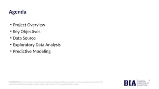 The document outlines a project by the Boston Institute of Analytics focused on developing a machine learning-based e-diagnosis system for predicting diabetes using the Pima Indian diabetes dataset. The key objectives include building a predictive model, identifying significant features for better interpretability, and addressing early diagnosis challenges. The predictive modeling process evaluated several algorithms, with the random forest classifier demonstrating the best performance.