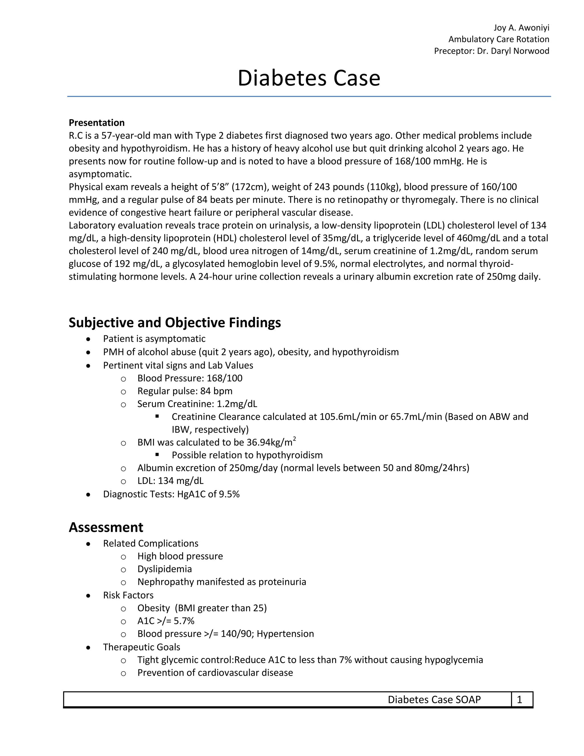This 57-year-old man with type 2 diabetes, obesity, and hypothyroidism presents for follow-up. He has high blood pressure, dyslipidemia, and early-stage diabetic nephropathy. Treatment is recommended including metformin, an ACE inhibitor, and statin to control blood sugar, blood pressure, and cholesterol. Lifestyle modifications including diet, exercise, and weight loss are also emphasized to manage his conditions. Monitoring of labs and symptoms is planned to assess treatment effectiveness and prevent further complications.