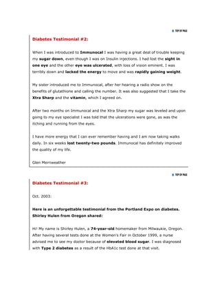 This document contains 9 testimonials from individuals who experienced positive health benefits after taking Immunocal to help manage their diabetes. Some key experiences mentioned include improved blood sugar control, reduced or eliminated need for diabetes medications, improved circulation and neuropathy symptoms, weight loss, improved eye and kidney conditions, increased energy levels and more. The testimonials demonstrate that Immunocal appeared to help these individuals better control their diabetes and experience an improved quality of life.