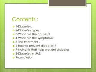 This document discusses diabetes, including the three main types (type 1, type 2, and gestational), causes, symptoms, treatment options, prevention strategies like diet and exercise, and the growing issue of diabetes in the UAE. Type 1 diabetes is caused by an autoimmune destruction of insulin-producing cells, while type 2 is often linked to genetics and lifestyle factors. Common symptoms include frequent urination, thirst, hunger, weight changes and fatigue. Treatment involves insulin, medications, diet, and physical activity. Healthy eating, active living, and routine testing can help prevent diabetes.