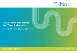 This document provides an introduction to a toolkit for structured education for Type 2 diabetes. It discusses the low uptake of structured education programs despite recommendations and incentives. The toolkit aims to address causes of low uptake and provide guidance to commissioners, providers, and referrers to ensure accessible high-quality structured education. It summarizes the national and local burden of diabetes, costs of complications, and recommends increasing attendance at education to save £1.7 million per CCG annually. Common structured education programs are introduced.