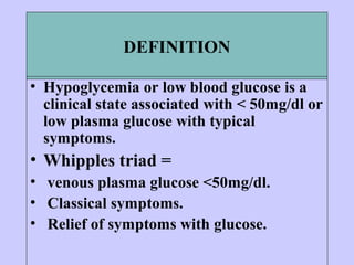 This document defines diabetic hypoglycemia and describes its causes, symptoms, and treatment. Hypoglycemia is low blood glucose below 50mg/dl causing symptoms that are relieved by raising blood glucose. It can be caused by excessive insulin, missed meals, exercise, or drugs interacting with insulin. Symptoms range from autonomic reactions to neuroglycopenic effects like confusion. Treatment involves oral glucose for conscious patients or IV glucose/glucagon for unconscious patients. Strict avoidance and glucose monitoring are needed to prevent hypoglycemia in insulin-treated diabetics.