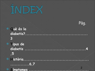 Pàg. Q uèés la diabetis?...........................................3 T ipus de diabetis ..........................................4,5 H istòria..........................................................6,7 S ímptomes ....................................................8,9 P revenció................................................10,11,12 I ncidència .......................................................13 C onseqüències ...........................................14,15 A ltres aspectes sobre la diabetis.......16,17,18,19