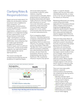 The document discusses the establishment of a cross-functional digital media council within companies to develop policies and best practices for digital and social media engagement. It emphasizes the importance of collaboration among various departments such as marketing, legal, and public relations to create a cohesive digital strategy while addressing regulatory guidelines. Additionally, it highlights the growing role of digital media influencers and social media applications in pharmaceutical communications and marketing strategies.