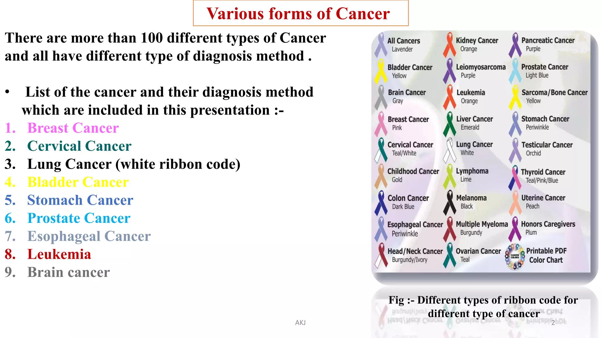 The document outlines various forms of cancer and their diagnosis methods, covering over 100 types of cancer, including breast, cervical, lung, bladder, stomach, prostate, esophageal, leukemia, and brain cancer. Each type has specific diagnostic procedures such as imaging tests, biopsies, and laboratory analyses to confirm the presence of cancer. It emphasizes the importance of early detection and various technological methods used for effective diagnosis.