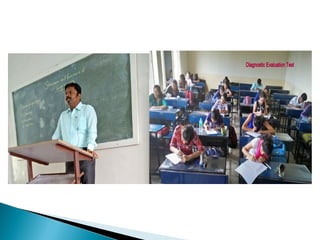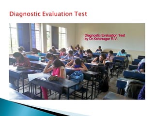 This document discusses diagnostic evaluation tests. It explains that diagnostic tests are a form of pre-assessment that allow teachers to understand students' strengths, weaknesses, knowledge and skills before instruction. They are used to diagnose student difficulties and guide lesson planning. Common forms include unit pretests and assessments before individual instruction. Diagnostic tests can be given at the start of a course and create a baseline for future learning. They help teachers provide remediation for slow learners and enrichment for advanced learners. The document also discusses using ICT (information and communication technology) in teaching and its positive impact on student performance.