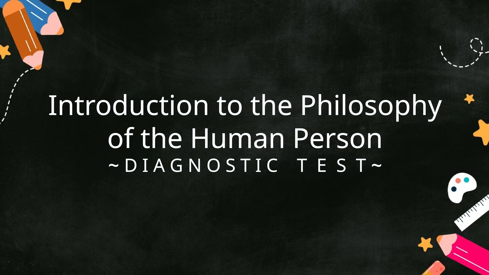 The document explores various philosophical questions and concepts related to the human person, including metaphysics, aesthetics, ethics, and societal norms. It features diagnostic test questions that address holistic perspectives, moral considerations, and the characteristics of human beings in different societal contexts. Additionally, it touches on the relationships between individuals and the philosophical implications of their interactions.