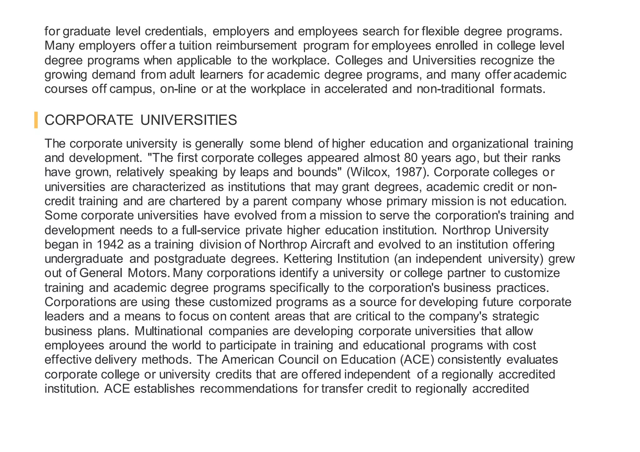 Many industry boards and associations have established mandatory continuing education requirements for licensure and certification. Continuing education includes non-credit courses that provide certificates and Continuing Education Units, as well as flexible degree programs through colleges and universities. Some large corporations have developed their own corporate universities to provide customized training and degree programs to develop leaders and focus on strategic business areas. The growth of distance education, including online learning, allows for more flexible participation and has increased opportunities for continuing education globally.