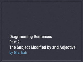 The document discusses diagramming sentences where the subject is modified by an adjective. It states that the subject of a sentence can be modified by one or more adjectives, as adjectives answer questions like "which", "what kind", "how many", and "whose". When diagramming a sentence, any adjectives modifying the subject are written on lines below the subject term. Examples are provided where the subject "girl" is modified by "bashful young" and the subject "Bible" is modified by "old family".