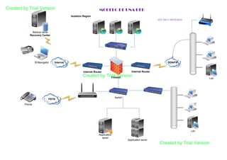 This document provides a diagram of a computer network model. The network includes an isolation region, backup server, and recovery center connected to the internet through routers and a firewall. Local area networks connect to application servers, switches, and other devices like phones.