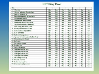 DBT is a therapy developed by Marsha Linehan to treat individuals with borderline personality disorder and emotional dysregulation. It combines cognitive behavioral therapy techniques with mindfulness practices. The core of DBT involves teaching clients skills in four areas: mindfulness, distress tolerance, emotion regulation, and interpersonal effectiveness. Through individual therapy, group skills training, coaching sessions, and therapist consultation, DBT aims to help clients learn to manage intense emotions, reduce self-harming behaviors, and build healthier relationships.