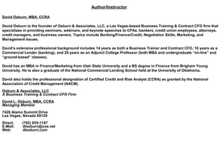 The document outlines a seminar led by David Osburn, a business trainer specializing in banking and finance, focused on skills necessary for effective telephone collections. Key topics include management styles, human factors affecting communication, negotiation techniques, and relevant legal aspects of debt collection. It also emphasizes the importance of being an efficient communicator and negotiator in order to achieve win-win situations in collections.