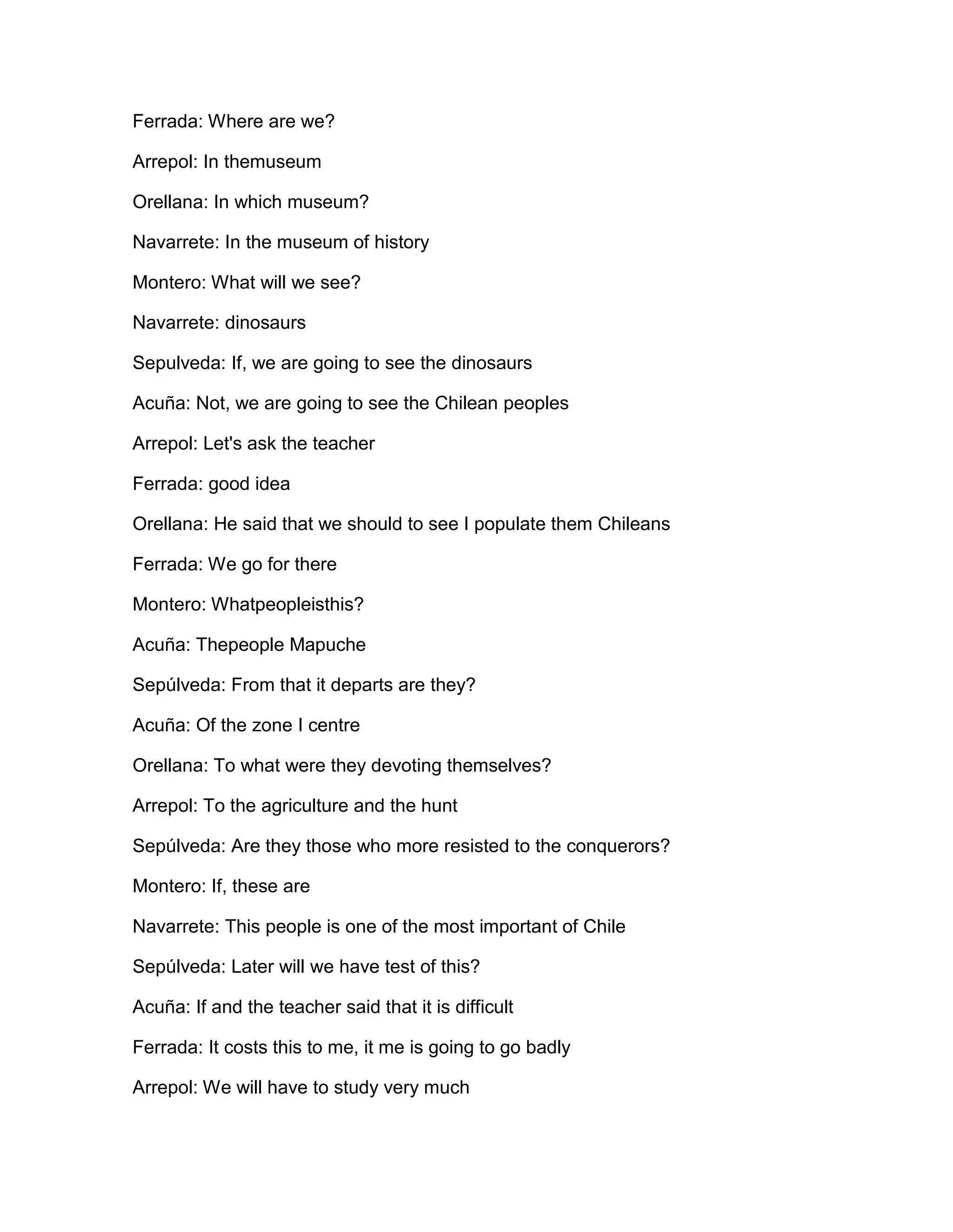 A group of students are on a field trip to the museum of history. They discuss with their teacher that they will be learning about the Mapuche people of Chile, rather than seeing dinosaurs as some had hoped. The students acknowledge they will need to study hard to do well on the upcoming test about the Mapuche people, one of the most important indigenous groups in Chile who long resisted foreign conquerors.
