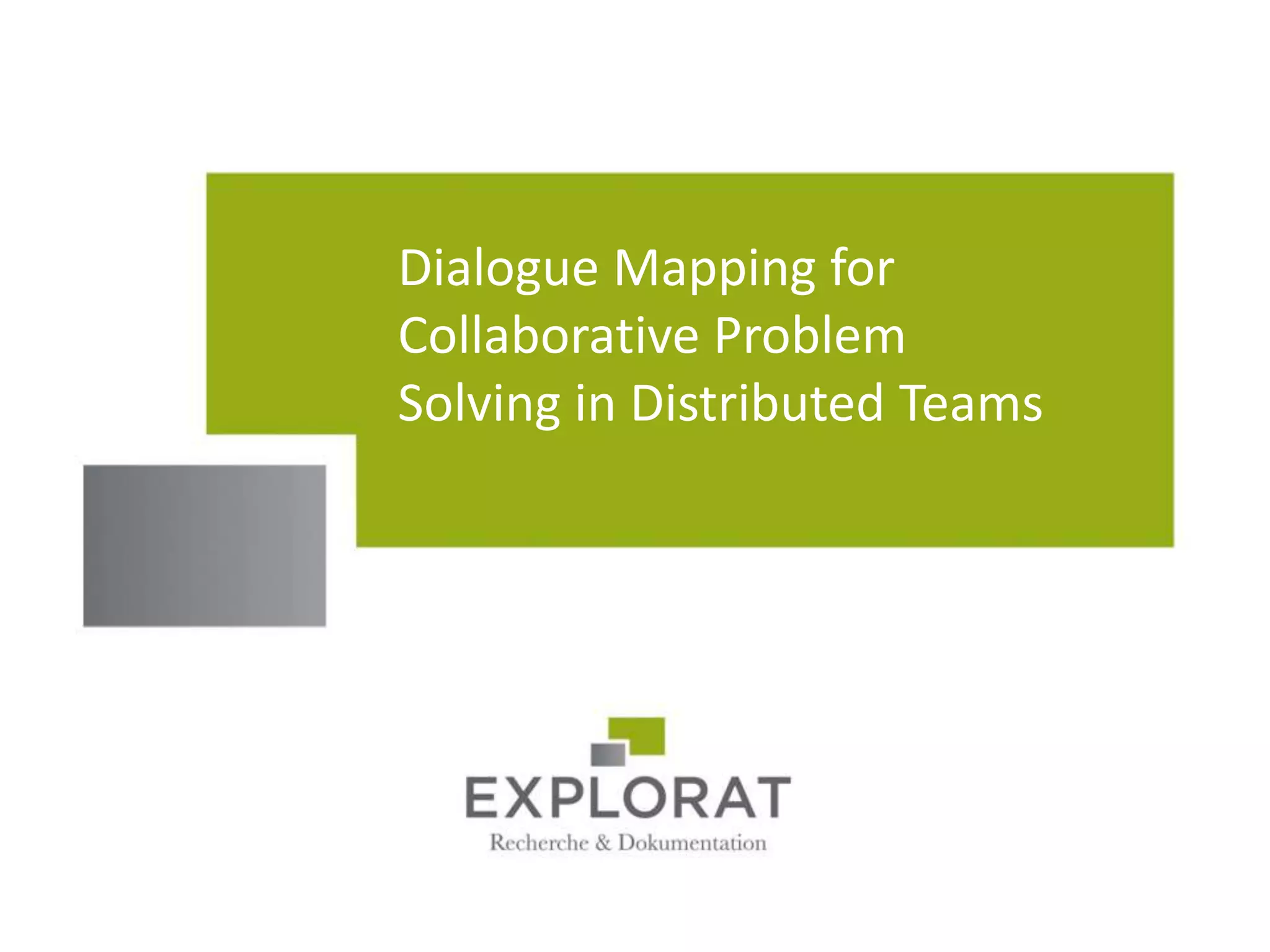 This document demonstrates how to map out a discussion on LinkedIn about the future of work. The initial discussion was unstructured, repetitive and unclear. Dialogue mapping involves chunking participants' statements and organizing them to show the overall structure and focus. It revealed the dominant topic was the rise of freelancing and virtual companies. The map also identifies open questions, debated claims, and which statements different stakeholders would find most relevant. Mapping the discussion led to a clearer understanding and could help continue collaborative problem solving.