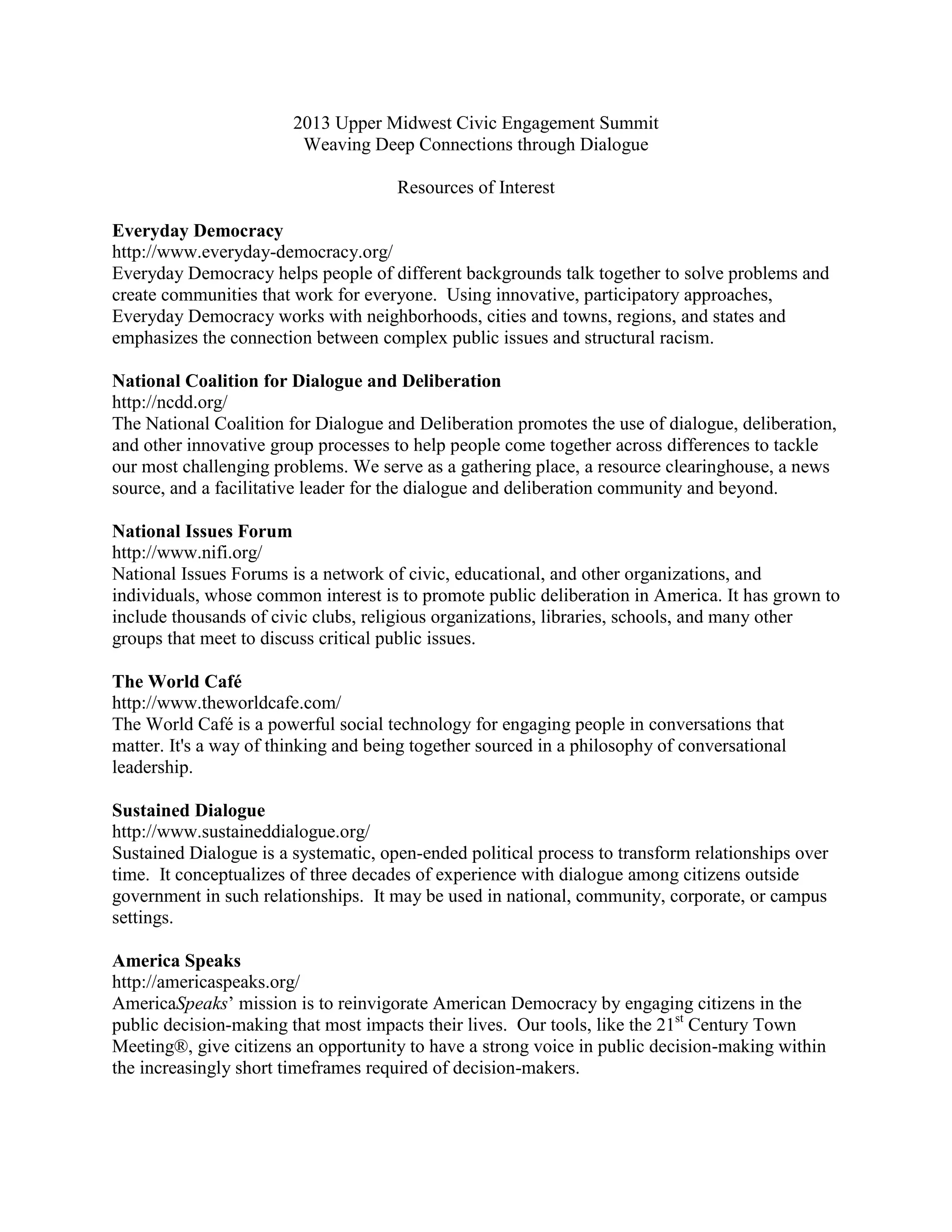 This document lists and provides brief descriptions of organizations that promote civic engagement and public deliberation on important issues. Some of the key organizations mentioned include Everyday Democracy, which helps facilitate discussions to solve community problems, the National Coalition for Dialogue and Deliberation, which promotes the use of dialogue to address challenges, and America Speaks, whose tools engage citizens in public decision making.